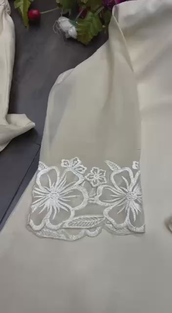 A premium cream designer co-ord set crafted from heavy Chinon fabric, featuring delicate embroidery on the sleeves and hem for an elegant, refined look. Paired with matching stitched pants, this lightweight and graceful outfit is perfect for festive gatherings, casual celebrations, and modern ethnic styling.